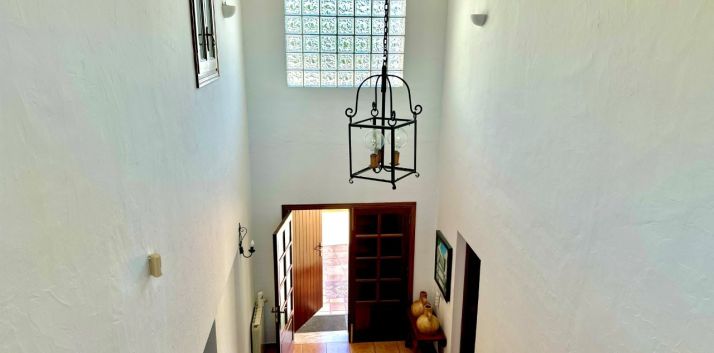 La casa cuenta con cuatro dormitorios y tres baños. La cocina está conectada con el salón, lo que crea una distribución funcional. También hay un anexo que se puede utilizar para invitados o personal.