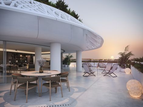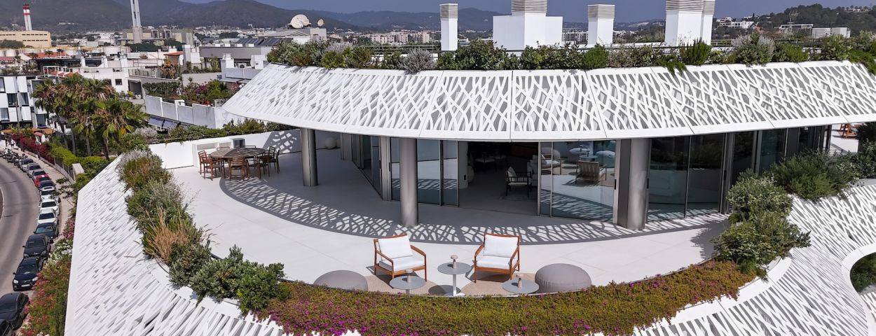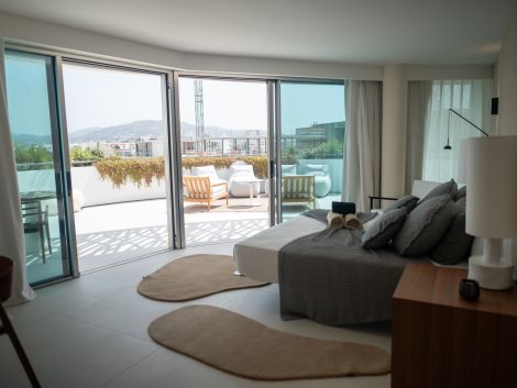 Ocupando la última planta, el ático presume de un diseño diáfano y fluido. La cocina, totalmente equipada, se abre a un elegante salón con puertas correderas de cristal que dan acceso a una terraza envolvente. La residencia incluye tres dormitorios dobles con baño en suite, una despensa y un patio interno que conduce a una terraza privada en la azotea con vistas de 360°, incluyendo Dalt Vila y la marina. Desde la terraza, los residentes disfrutan de acceso privado a la piscina de la azotea y a una zona de descanso exclusiva.