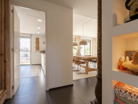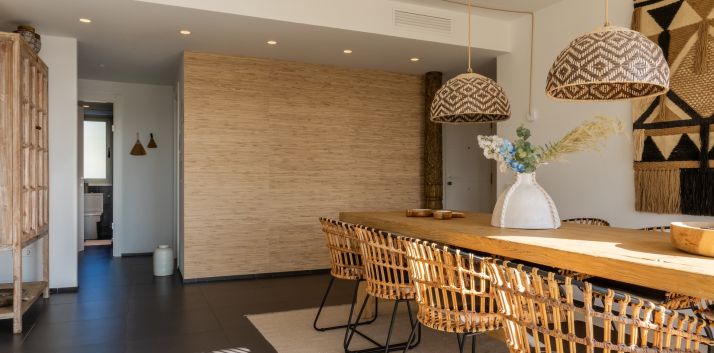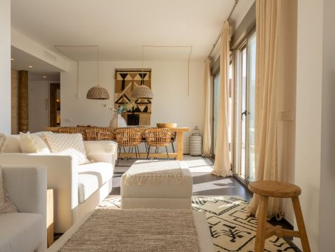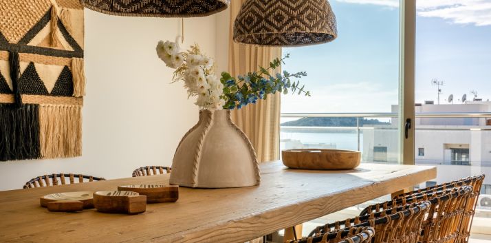El luminoso salón-comedor destaca por sus amplios ventanales, que ofrecen impresionantes vistas panorámicas al mar, a Dalt Vila y al puerto de Ibiza. La cocina, independiente y totalmente equipada, ha sido diseñada para ofrecer practicidad y confort en el día a día.