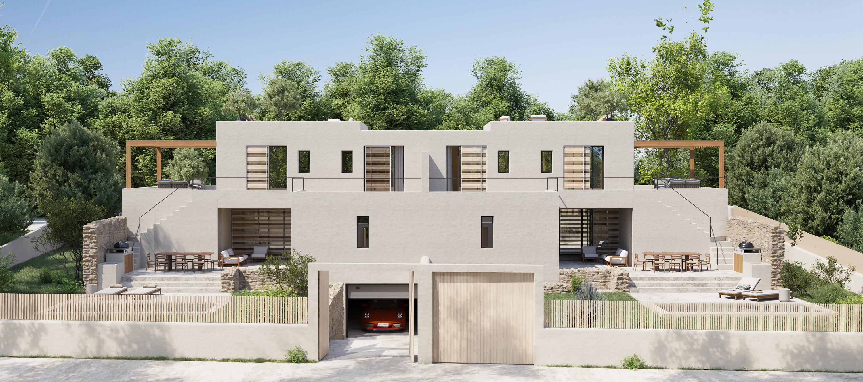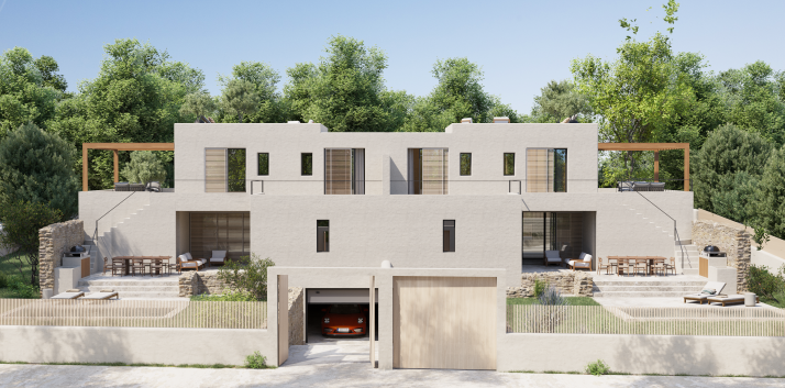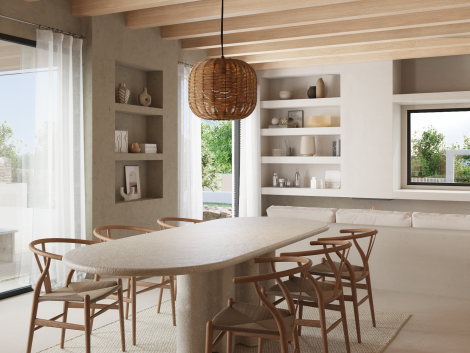 This new build house features modern architecture influenced by traditional Ibiza design, offering a practical and comfortable layout.