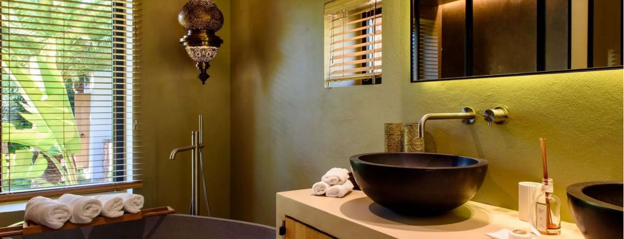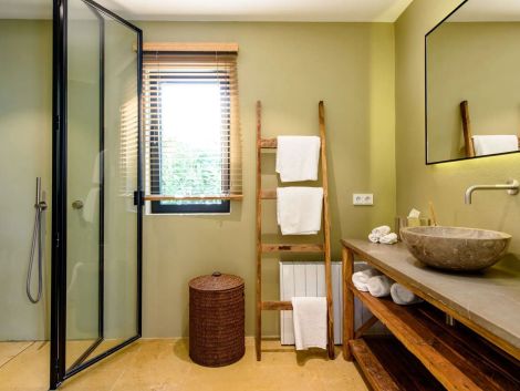 Located next to the pool, it offers three additional en-suite bedrooms. Two are situated on the ground floor with direct access to the terrace, while the third is on the upper floor and includes a private fridge and balcony.