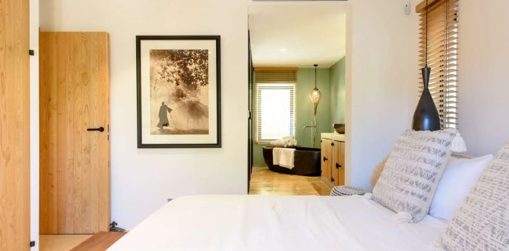 Features a fully equipped designer kitchen with double appliances, a spacious living area, and a dining table that comfortably seats 12 guests. The ground floor hosts two en-suite bedrooms, while the upper floor is dedicated to the impressive master suite, complete with a four-poster bed and a private terrace.