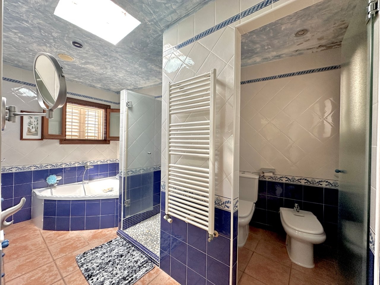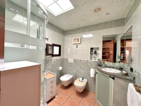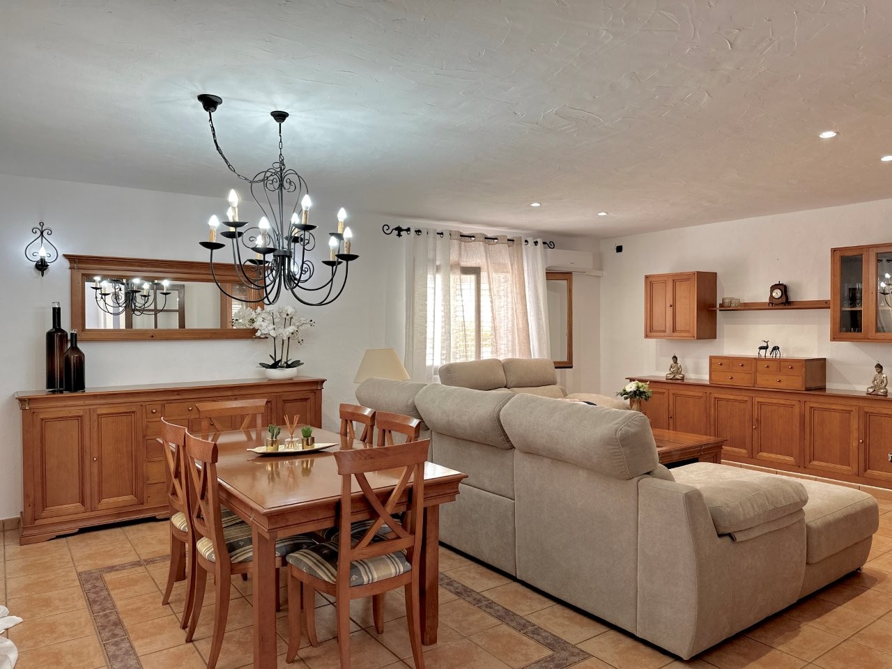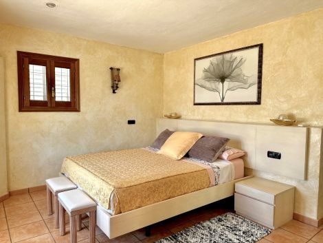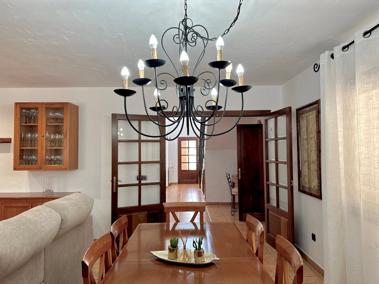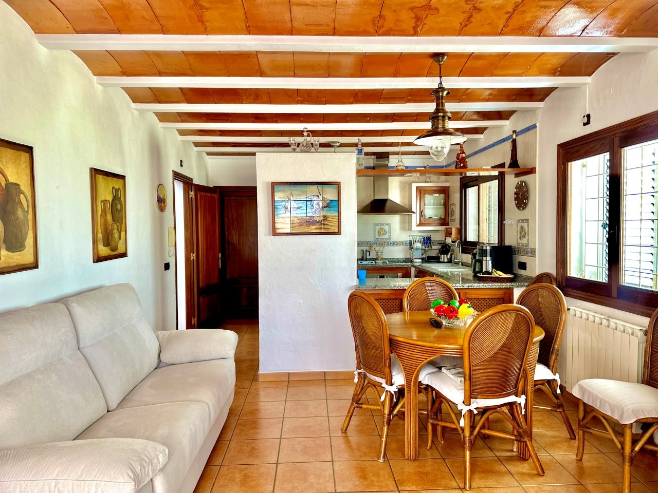 La casa cuenta con cuatro dormitorios y tres baños. La cocina está conectada con el salón, lo que crea una distribución funcional. También hay un anexo que se puede utilizar para invitados o personal.
