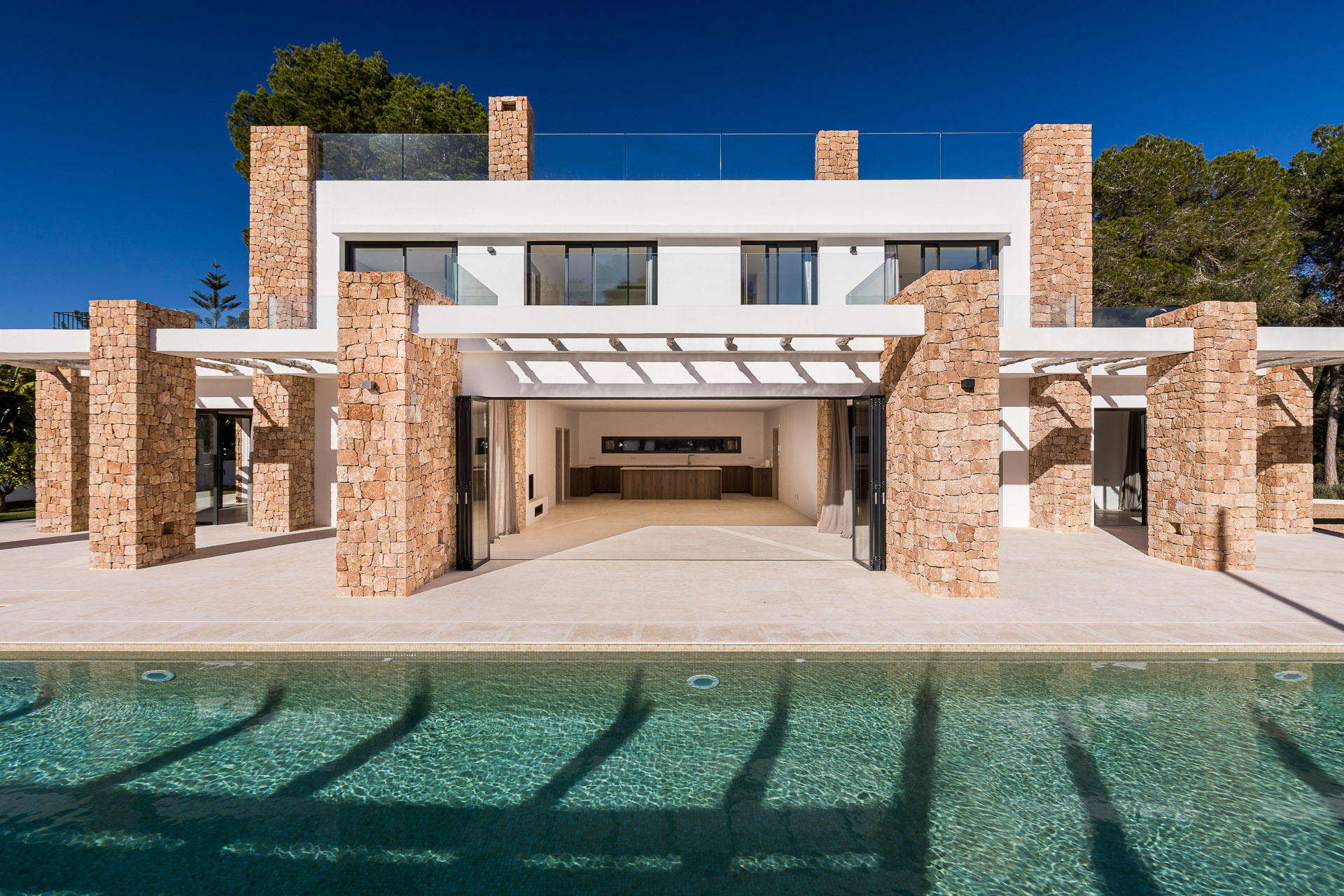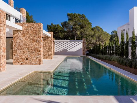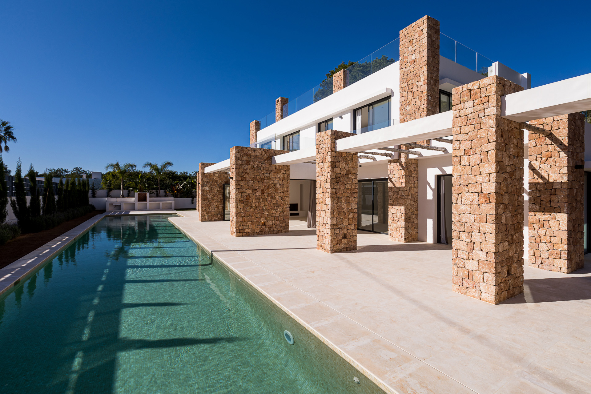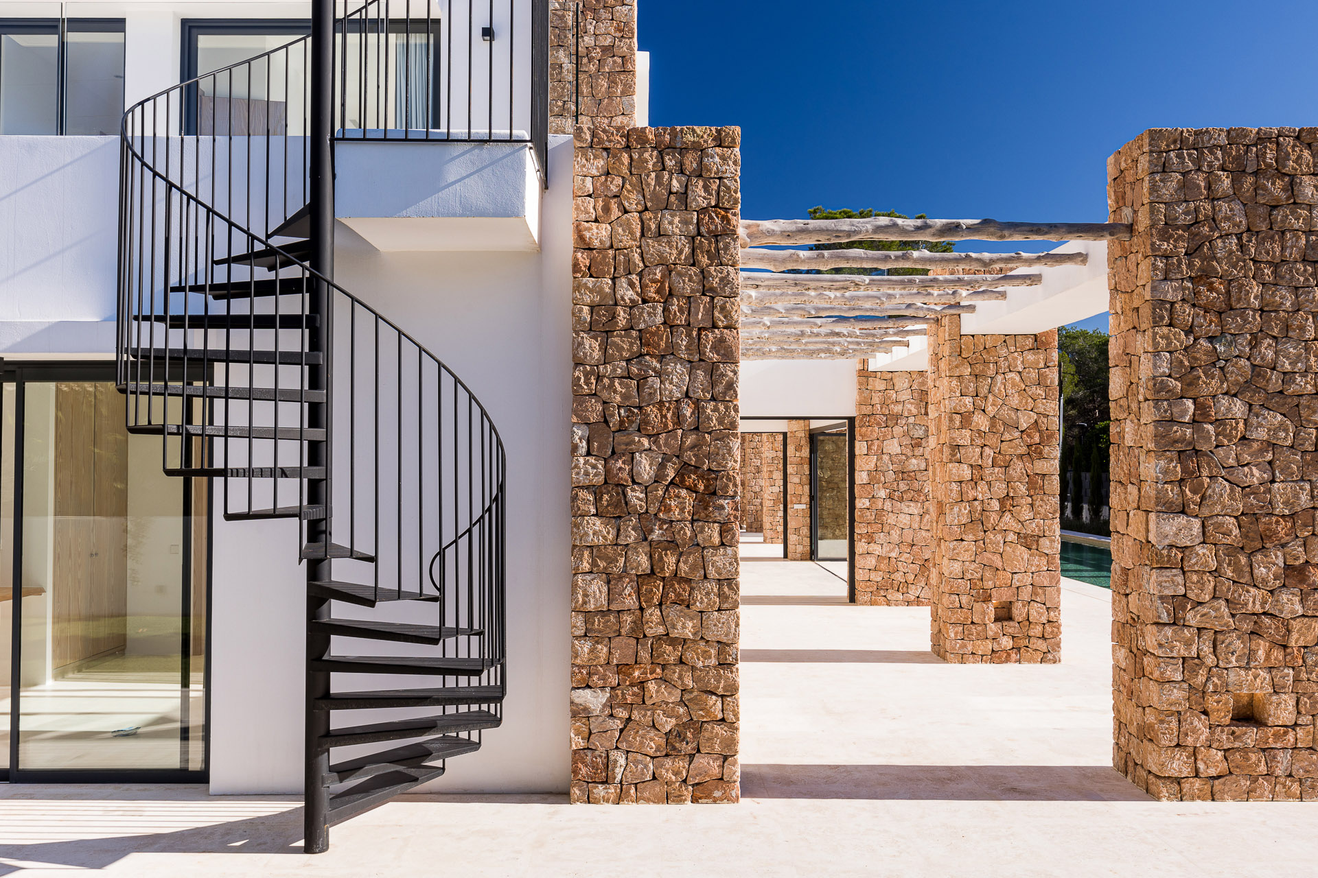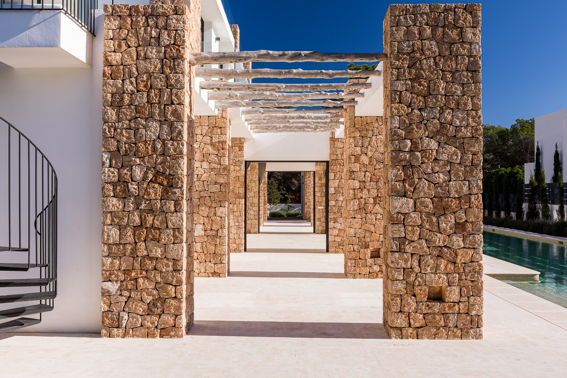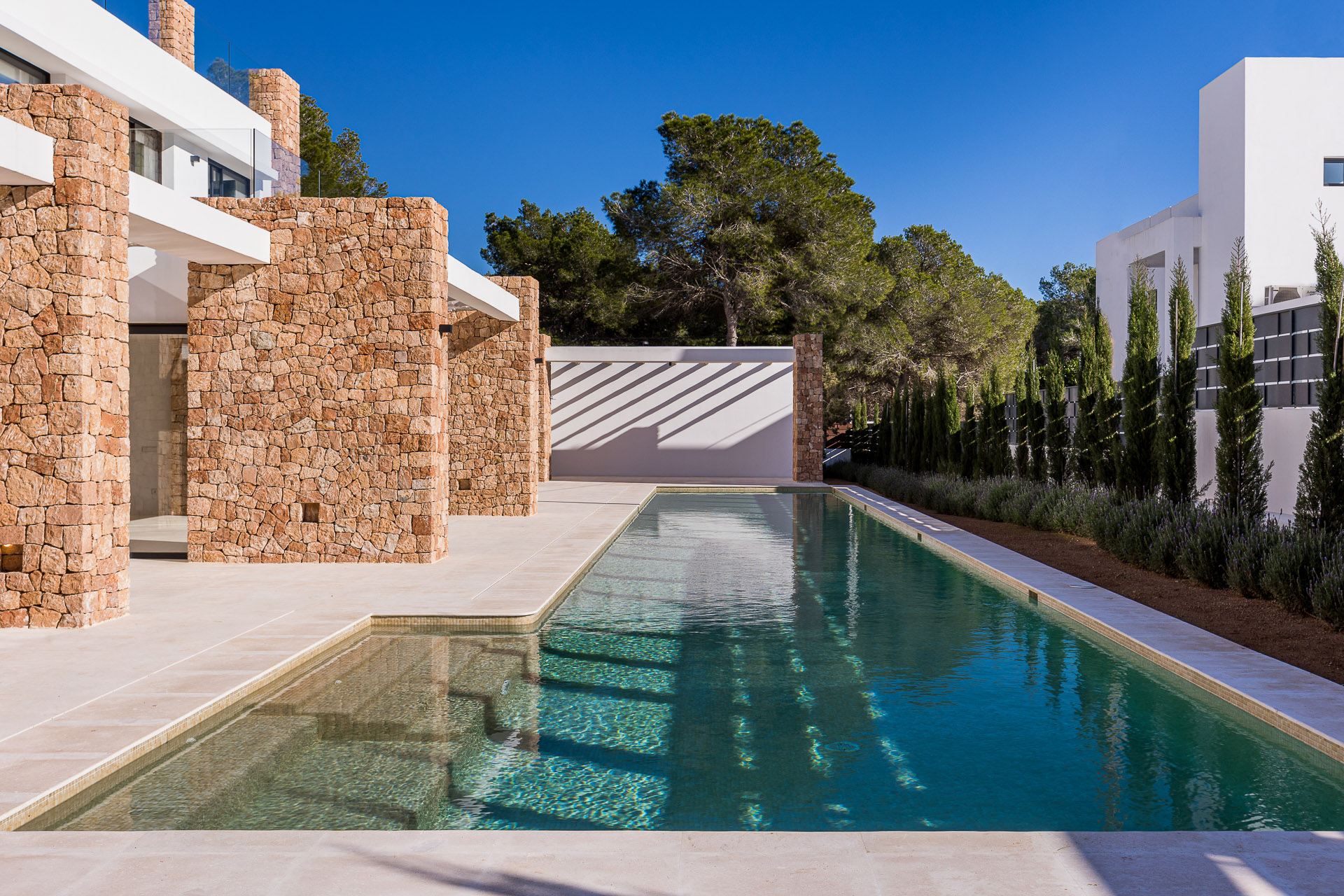 Can Masia fue diseñada por el amor que su propietario tiene por el diseño moderno y demuestra cómo la sostenibilidad puede crear belleza. Para esta casa contemporánea de alto standing, utilizamos tecnología SISMO, un innovador sistema de celosía de acero inoxidable con una espuma porosa en el interior. Este eficiente y modular marco requirió de menos hormigón. Además, produjo paredes naturalmente ventiladas para un entorno de vida eficiente y sostenible. Equilibramos el diseño con piedra ibicenca que conectaba la casa a su entorno natural