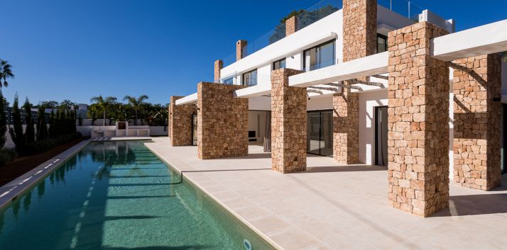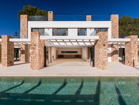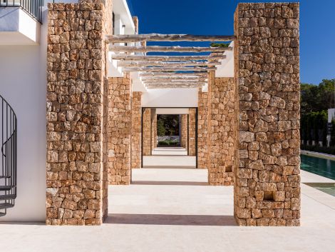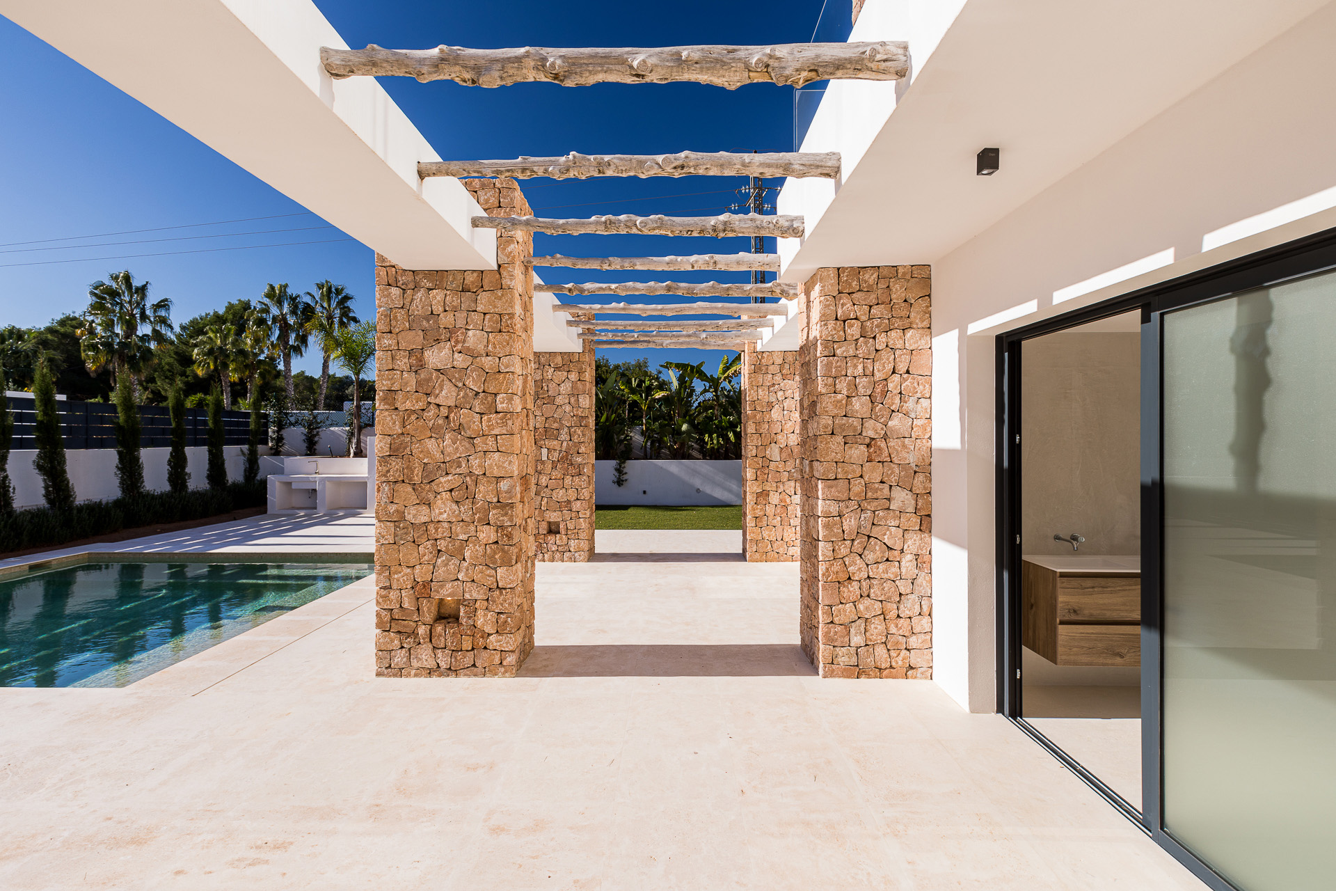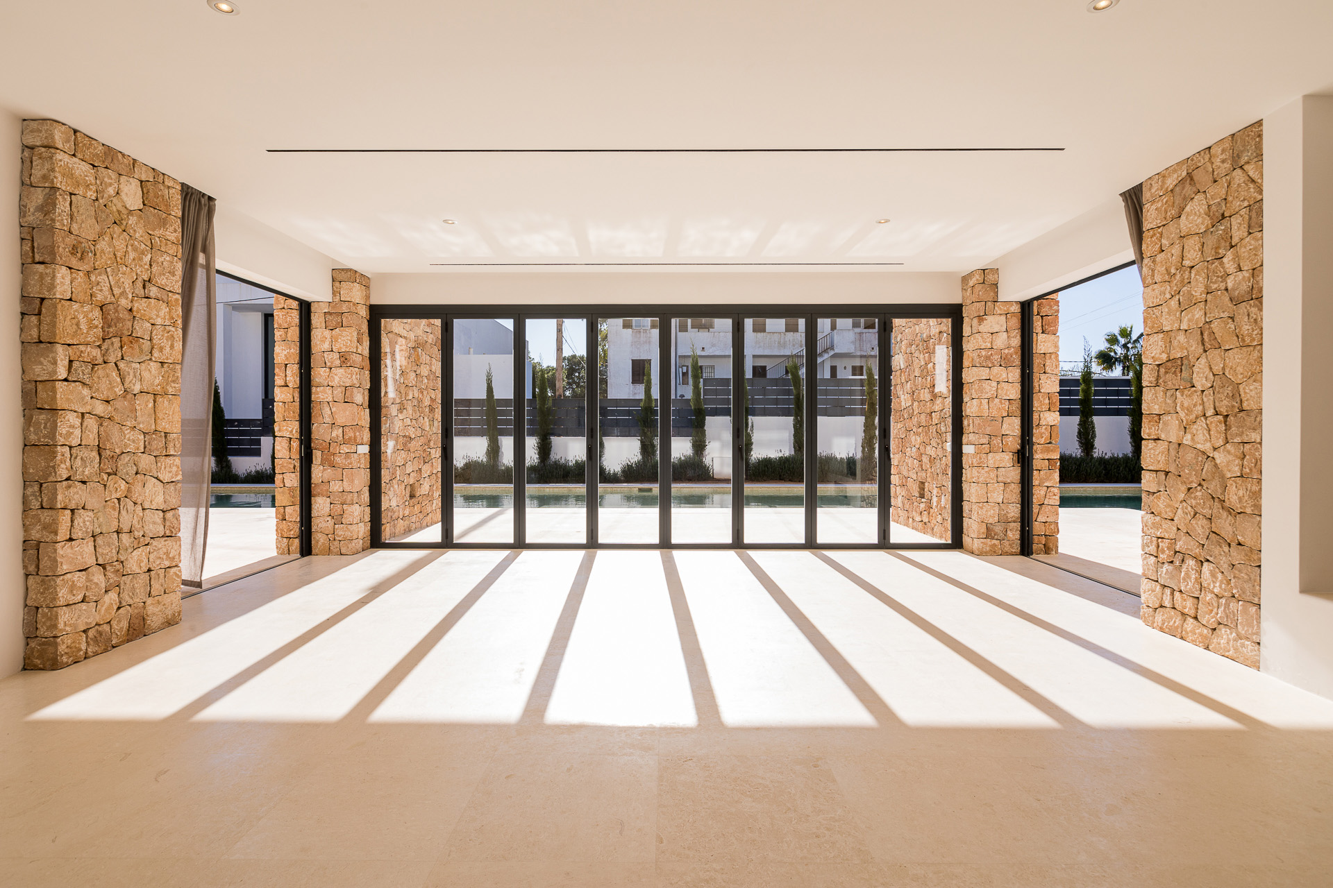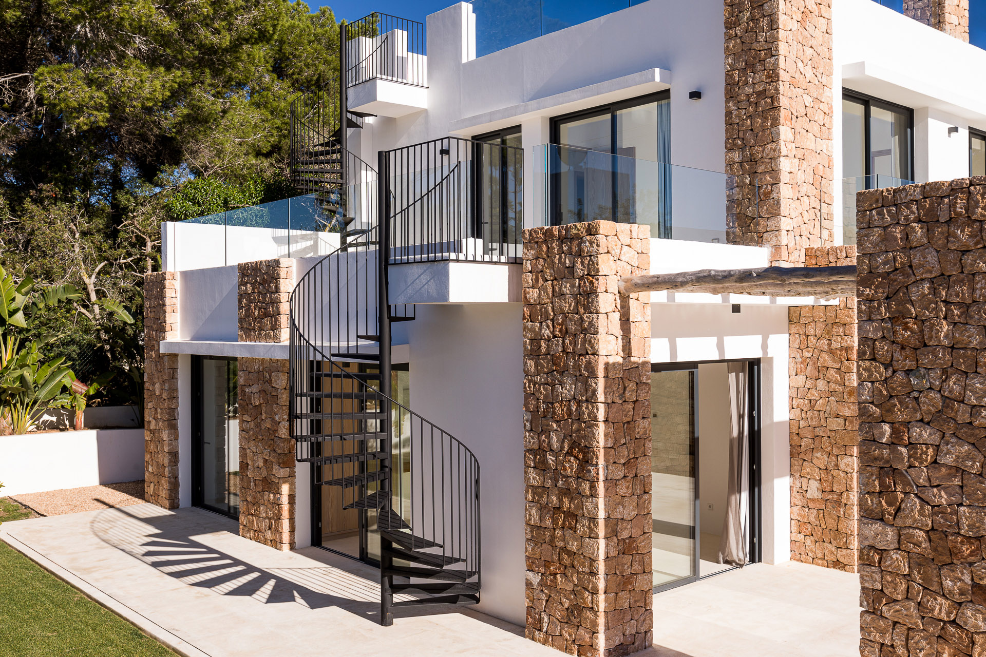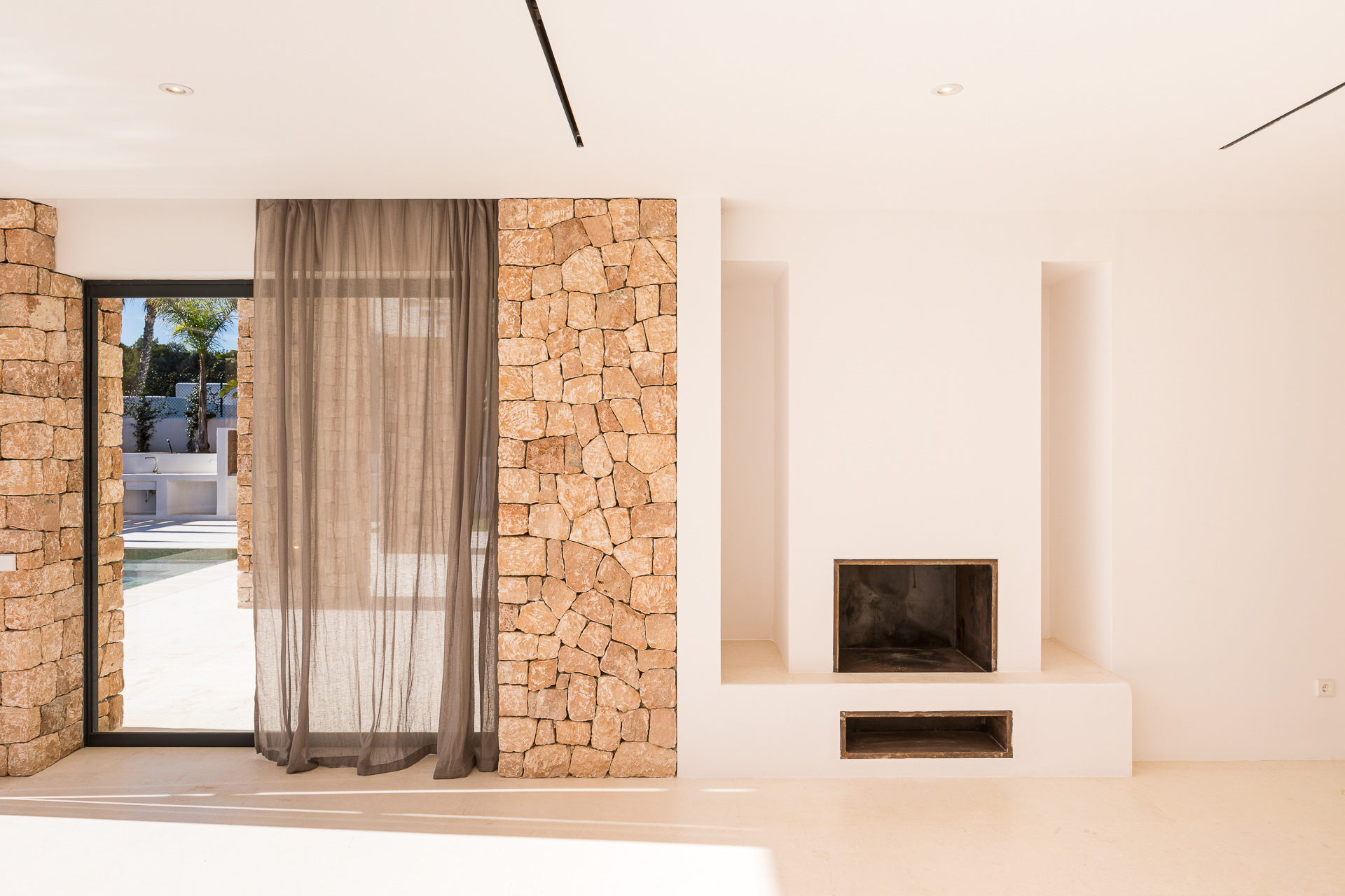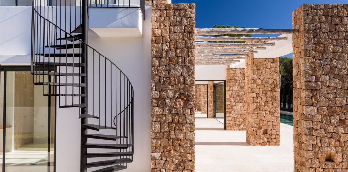 Can Masia fue diseñada por el amor que su propietario tiene por el diseño moderno y demuestra cómo la sostenibilidad puede crear belleza. Para esta casa contemporánea de alto standing, utilizamos tecnología SISMO, un innovador sistema de celosía de acero inoxidable con una espuma porosa en el interior. Este eficiente y modular marco requirió de menos hormigón. Además, produjo paredes naturalmente ventiladas para un entorno de vida eficiente y sostenible. Equilibramos el diseño con piedra ibicenca que conectaba la casa a su entorno natural