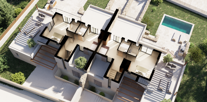 This new build house features modern architecture influenced by traditional Ibiza design, offering a practical and comfortable layout.